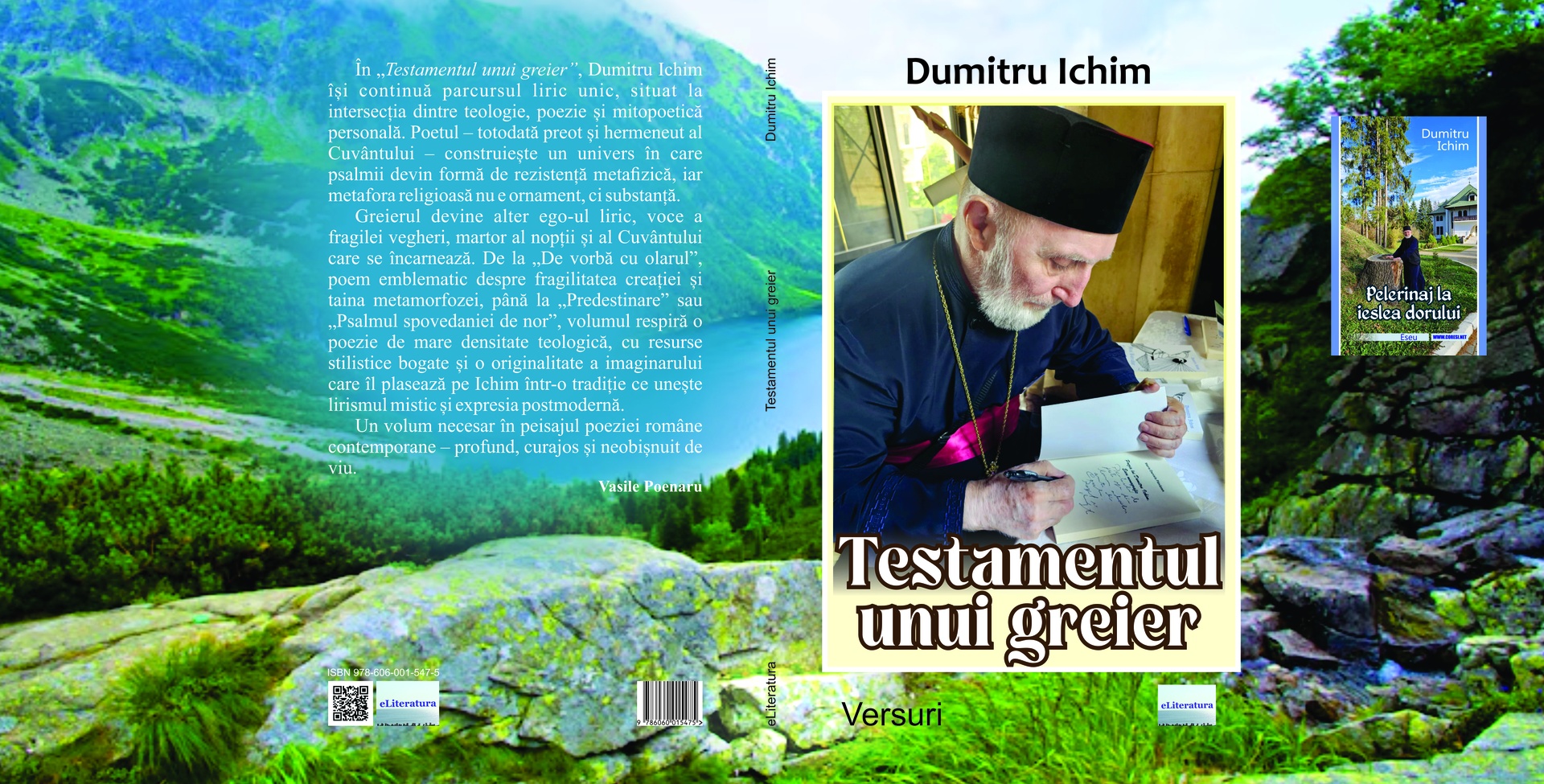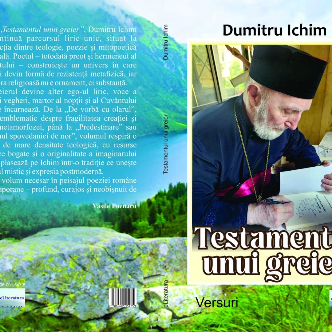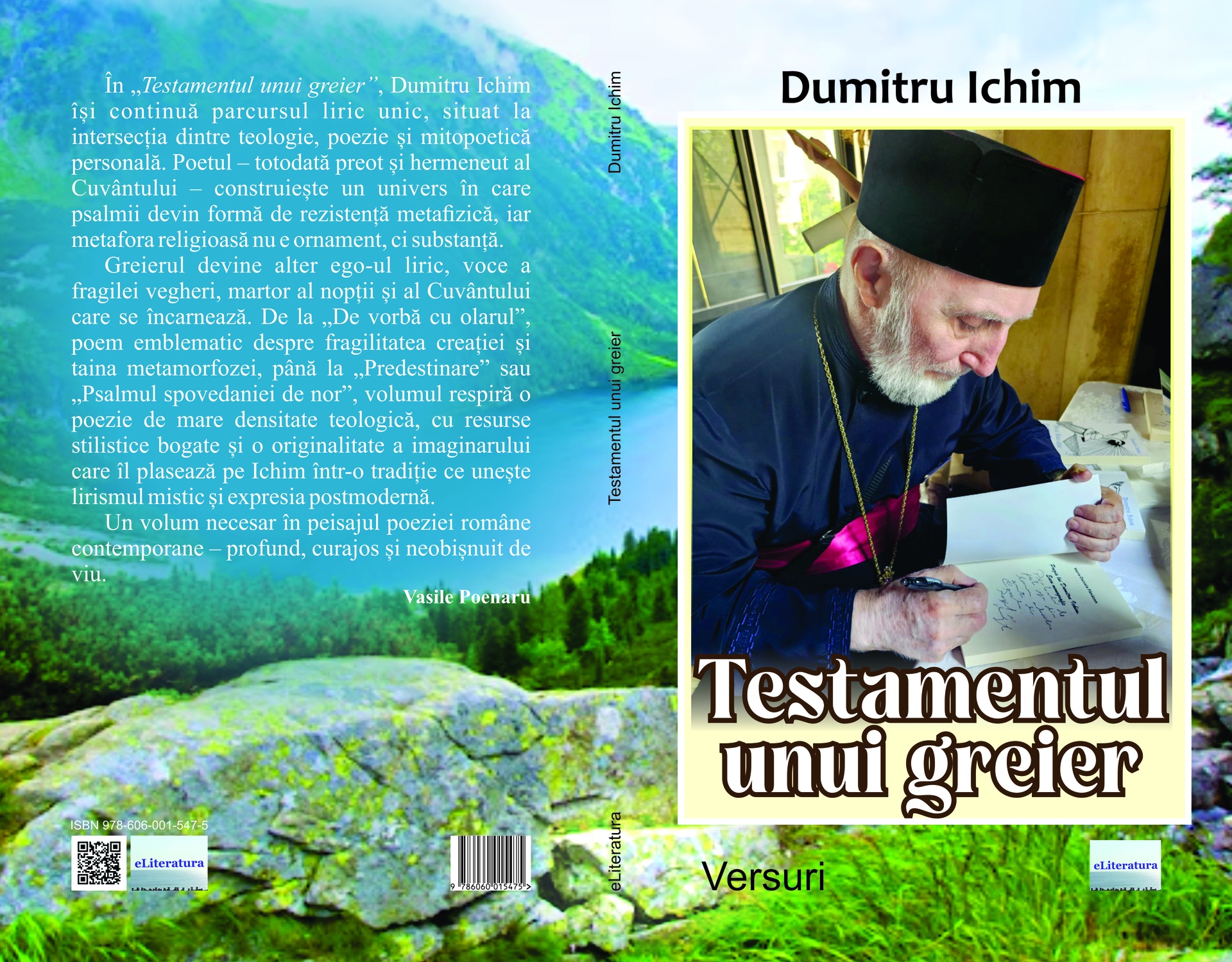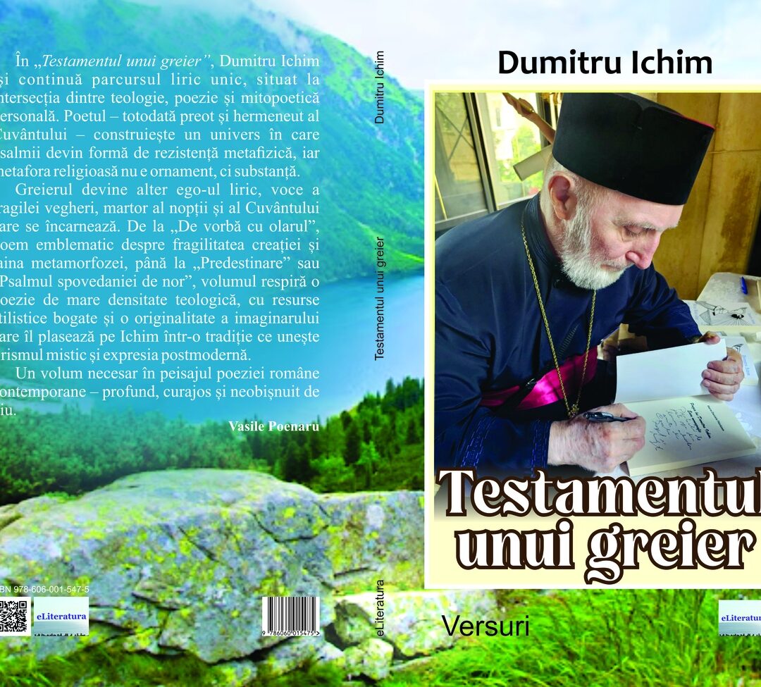 În „Testamentul unui greier”, Dumitru Ichim își continuă parcursul liric unic, situat la intersecția dintre teologie, poezie și mitopoetică personală. Poetul – totodată preot și hermeneut al Cuvântului – construiește un univers în care psalmii devin formă de rezistență metafizică, iar metafora religioasă nu e ornament, ci substanță.